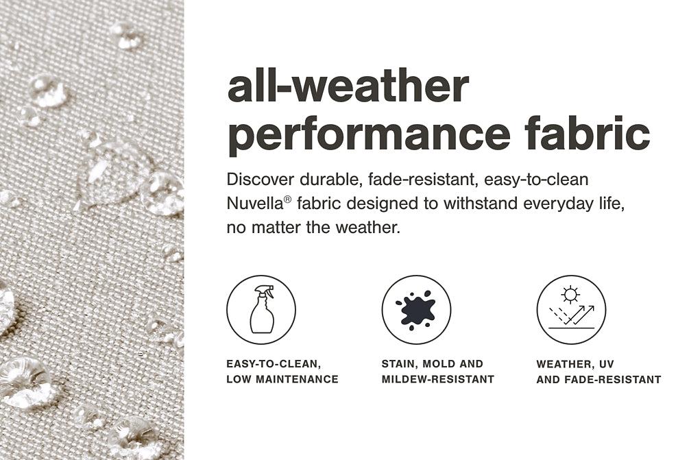 | Details | Includes 8 modular pieces: 6 outdoor lounge chairs and 2 outdoor end tables, Chair frame and table made with aluminum, Solution-dyed high-performance fabric, Nuvella® is an outdoor fabric that can be cleaned and offers UV resistance, Stainless steel hardware, Designed to withstand the harsh elements of the outdoors, Cushioned seat, Back cushion included, Includes PVC protective weather cover, Clean fabric with mild soap and water, let air dry; for stubborn stains, use a solution of 1 cup bleach to 1 gallon water, Assembly required | |