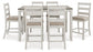 | Details | Includes counter height dining table and 6 counter height bar stools, Table made with hardwood solids, acacia veneer and MDF substrate, Stools made with solid wood frames, Grayish white finish with rub through effect, Table top with brown wood-tone finish, Polyester upholstery, Foam cushioned seats, Assembly required | |